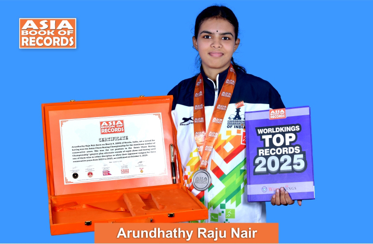 Arundhathy Raju Nair (born on March 8, 2005) of Kerala, India, set a record for having won the Asian Chess Boxing Championship for the maximum number of consecutive years. She won the 1st position in the ‘Asian Chess Boxing Championship’ (players play alternate rounds of rapid chess and boxing until one of them wins in either discipline or when their opponent resigns) for three consecutive years from 2023 to 2025, as confirmed on October 3, 2025.