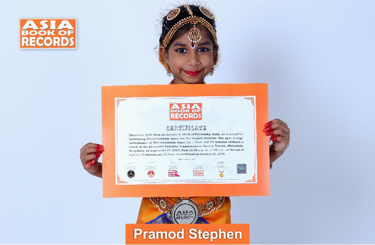 Dhruvi Sri Ajith (born on October 5, 2018) of Karnataka, India, set a record for performing Bharatanatyam dance for the longest duration. She gave a stage performance of Bharatanatyam dance for 1 hour and 40 minutes (without a break) at Sri Bhooneela Sametha Venkataramana Swamy Temple, Whitefield, Bengaluru, on September 17, 2025, from 10.05 a.m. to 11.45 a.m., at the age of 6 years, 11 months and 12 days, as confirmed on October 24, 2025.