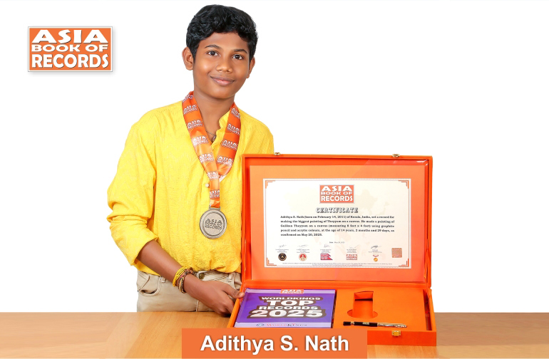 Adithya S. Nath (born on February 14, 2011) of Kerala, India, set a record for making the biggest painting of Theyyam on a canvas. He made a painting of Gulikan Theyyam on a canvas (measuring 8 feet x 4 feet) using graphite pencil and acrylic colours, at the age of 14 years, 2 months and 29 days, as confirmed on May 20, 2025.