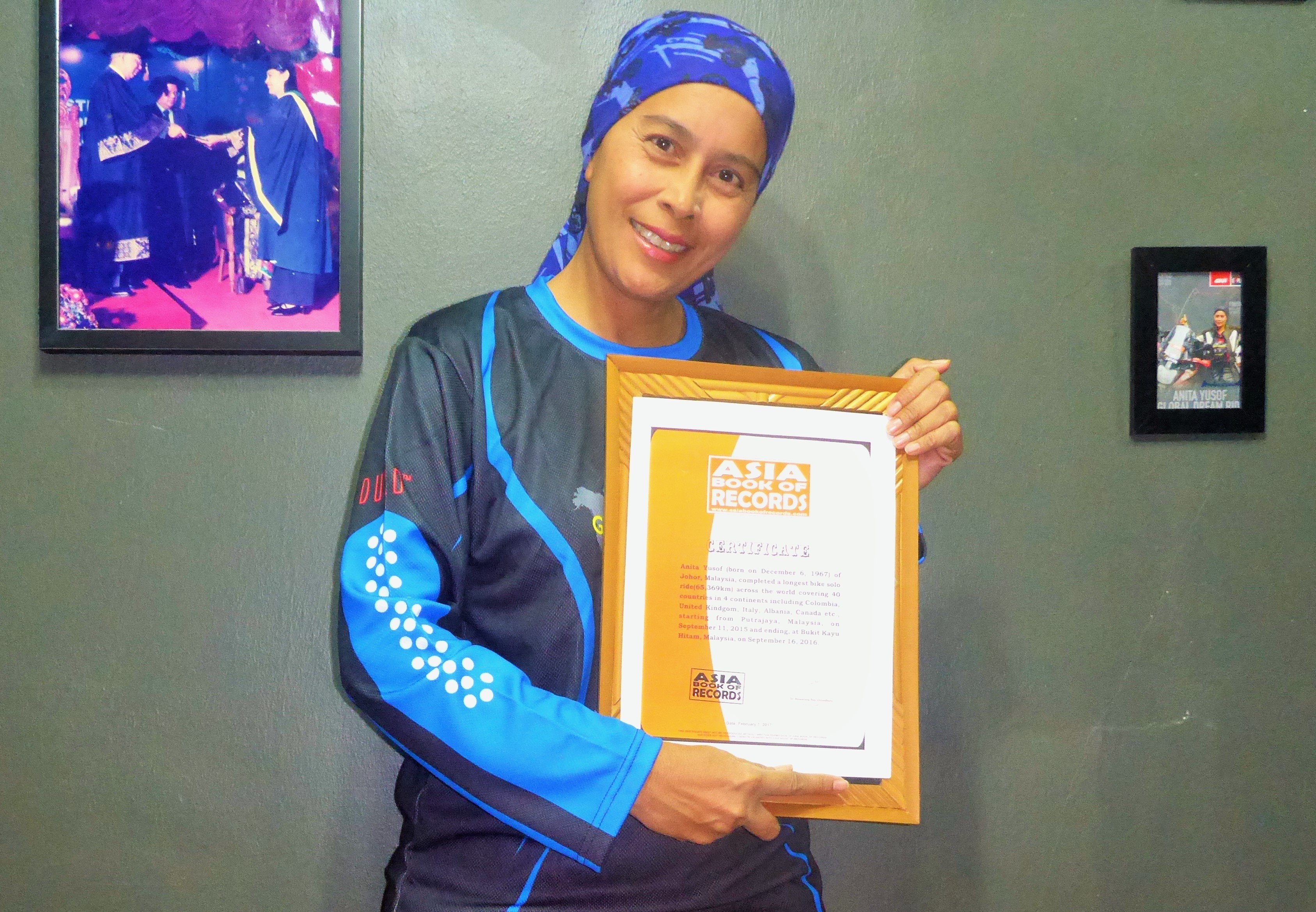 Anita Yusof (born on December 6, 1967) of Johor, Malaysia, completed a longest bike solo ride(65,369km) across the world covering 40 countries in 4 continents including Colombia, United Kindgom, Italy, Albania, Canada etc., starting from Putrajaya, Malaysia, on September 11, 2015 and ending, at Bukit Kayu Hitam, Malaysia on September 16, 2016.