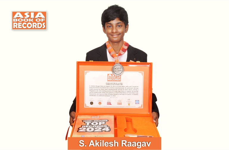 S. Akilesh Raagav (born on August 16, 2011) of Tamil Nadu, India, set a record for being the fastest to perform four activities simultaneously. He performed 109 hula hoops (around his waist) while simultaneously moving on inline skates, solving a Megaminx cube and recalling answers of 8 single digit sums in 1 minute, 20 seconds and 54 milliseconds (under the guidance of Anand Rajendran of Tamil Nadu Cube Association and Jayasree Nitin of Hobby School), at the age of 12 years, 11 months, and 28 days, as confirmed on August 13, 2024.