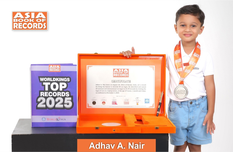 Adhav A. Nair (born on August 26, 2021) of Kerala, India, set a record for being the fastest to identify 50 car logos . He identified and named 50 national and international car logos in 24.39 seconds by viewing the logos of cars on a laptop screen, at the age of 4 years, 1 month and 3 days, as confirmed on November 3, 2025.