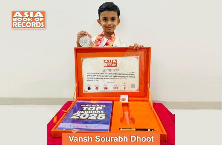 Vansh Sourabh Dhoot (born on July 3, 2020) of Maharashtra, India, set a record for being the fastest to recite the names of all Indian states with capitals alphabetically. He recited the names of all 28 Indian states alphabetically from A to Z, along with capitals, in 22.90 seconds, at the age of 5 years, 2 months and 19 days, as confirmed on October 10, 2025.