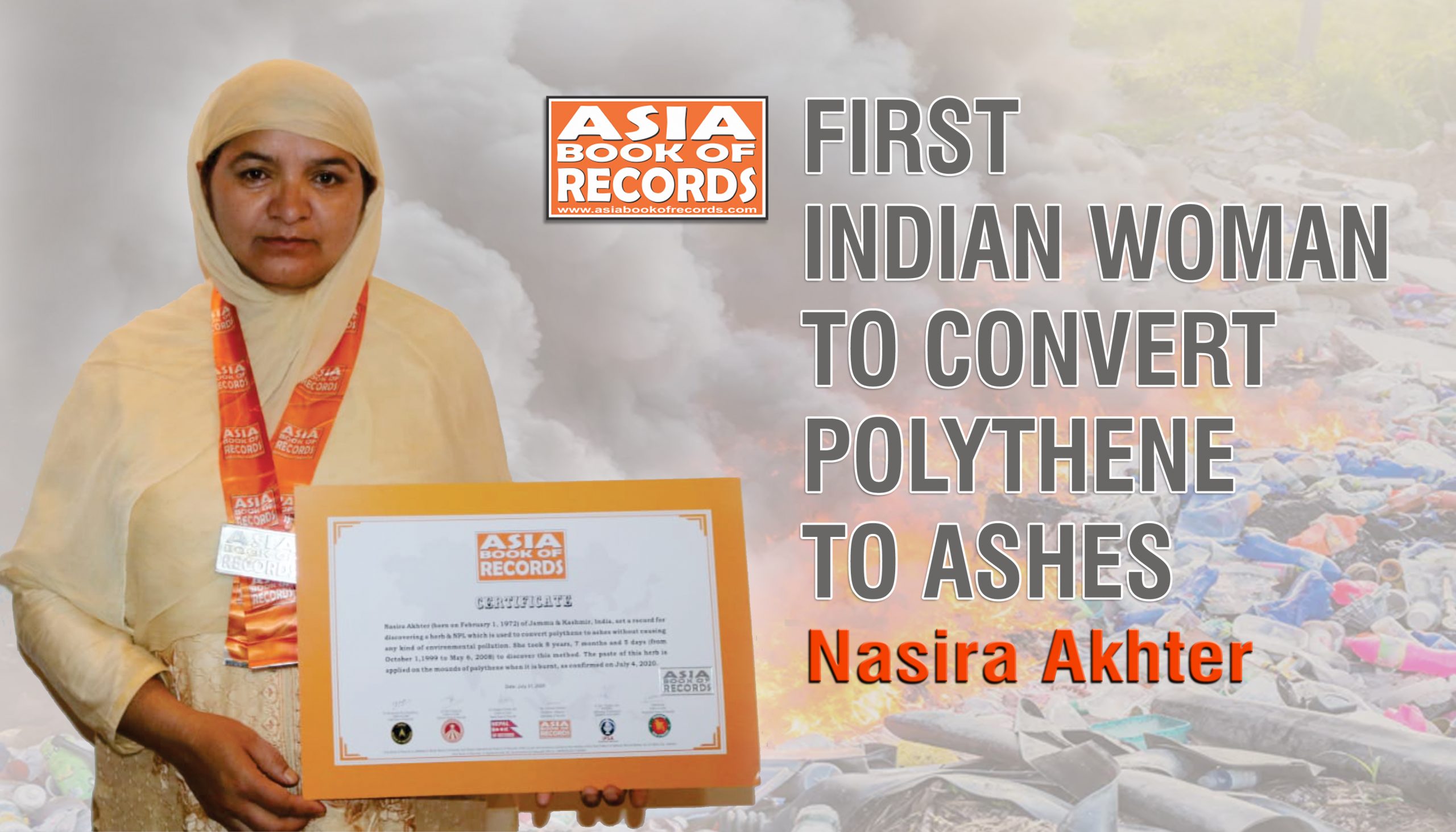 Nasira Akhter (born on February 1, 1972) of Jammu & Kashmir, India, set a record for discovering a herb & NPL which is used to convert polythene to ashes without causing any kind of environmental pollution. She took 8 years, 7 months and 5 days (from October 1, 1999 to May 6, 2008) to discover this method. The paste of this herb is applied on the mounds of polythene when it is burnt, as confirmed on July 4, 2020.