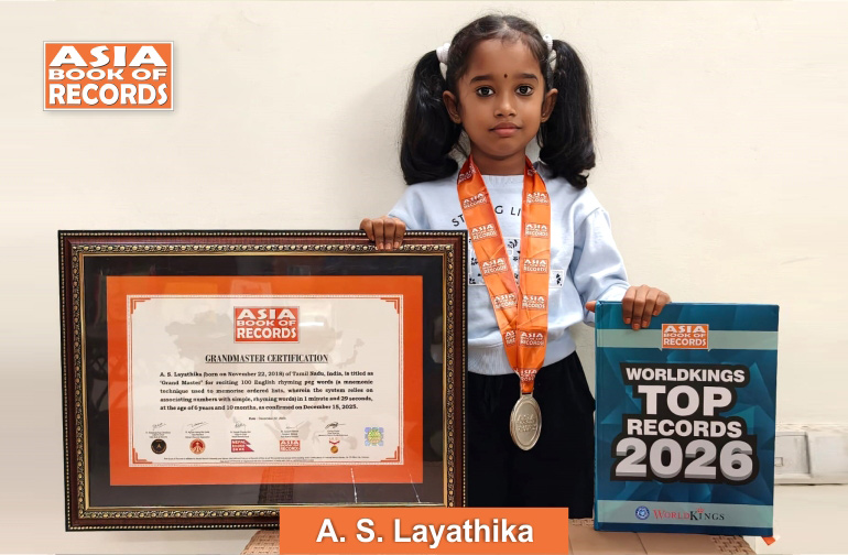 A. S. Layathika (born on November 22, 2018) of Tamil Nadu, India, is titled as ‘Grand Master’ for reciting 100 English rhyming peg words (a mnemonic technique used to memorise ordered lists, wherein the system relies on associating numbers with simple, rhyming words) in 1 minute and 29 seconds, at the age of 6 years and 10 months, as confirmed on December 15, 2025.