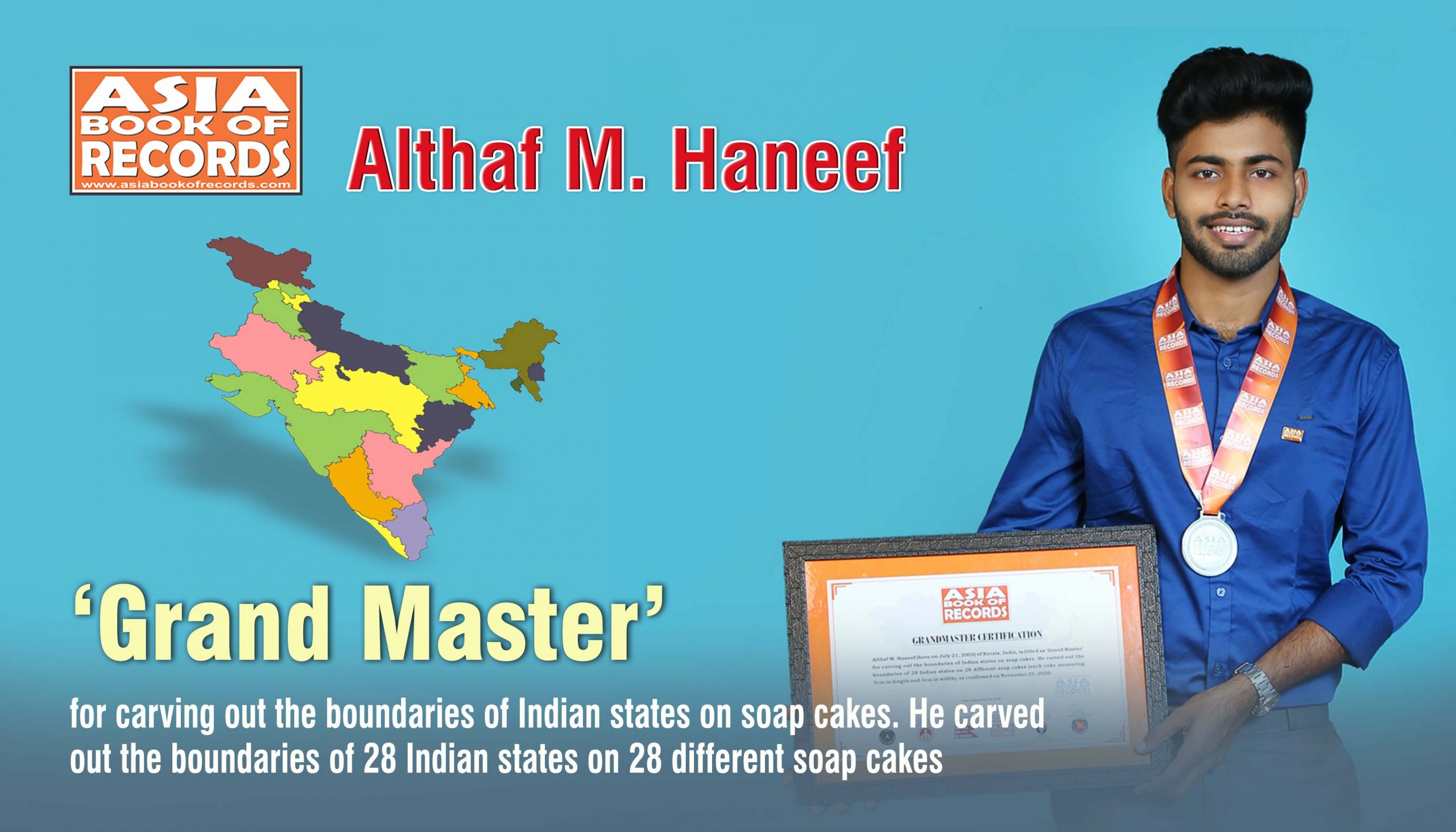 Althaf M. Haneef (born on July 21, 2002) of Kerala, India, is titled as ‘Grand Master’ for carving out the boundaries of Indian states on soap cakes. He carved out the boundaries of 28 Indian states on 28 different soap cakes (each cake measuring 5cm in length and 3cm in width), as confirmed on November 25, 2020.