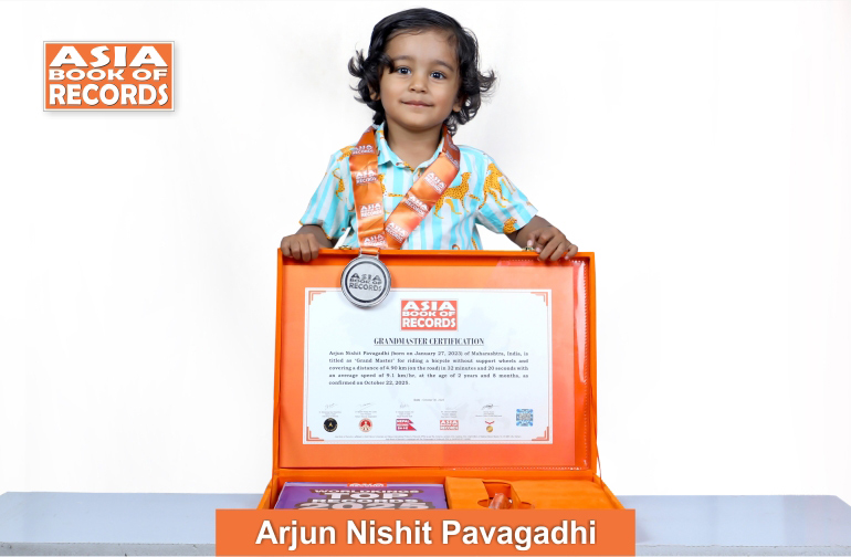 Arjun Nishit Pavagadhi (born on January 27, 2023) of Maharashtra, India, is titled as ‘Grand Master’ for riding a bicycle without support wheels and covering a distance of 4.90 km (on the road) in 32 minutes and 20 seconds with an average speed of 9.1 km/hr, at the age of 2 years and 8 months, as confirmed on October 22, 2025.