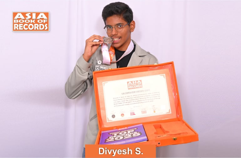 Divyesh S. (born on July 13, 2010) of Puducherry, India, is titled as ‘Grand Master’ for authoring a self-help book in English, consisting of 118 pages, titled ‘The Crowned Mind: Mastering Self to Conquer the World’ (ISBN: 979-89-00071-35-0), published by Notion Press, at the age of 15 years and 1 month, as confirmed on September 9, 2025.
