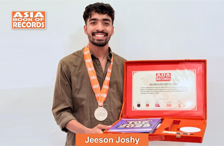 Jeeson Joshy (born on July 30, 2003) of Kerala, India, is titled as ‘Grand Master’ for making a small Origami heart (measuring 0.4 cm x 0.4 cm) with his fingers in 3 minutes and 41 seconds, using Origami paper, as confirmed on August 7, 2025.