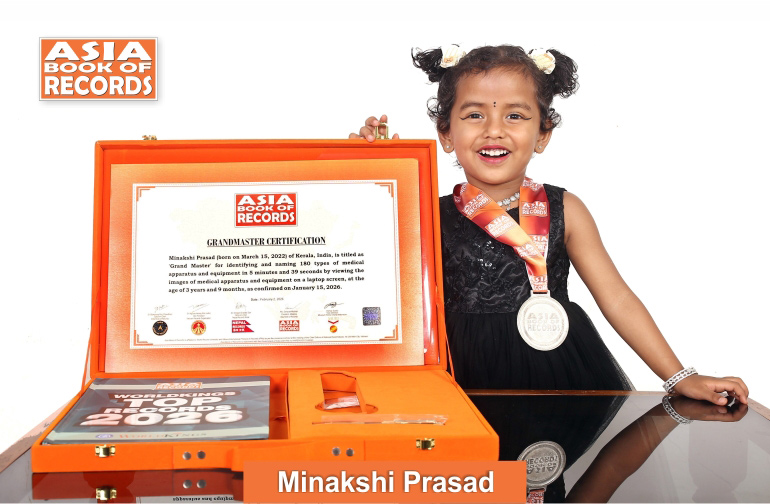 Minakshi Prasad (born on March 15, 2022) of Kerala, India, is titled as ‘Grand Master’ for identifying and naming 180 types of medical apparatus and equipment in 5 minutes and 39 seconds by viewing the images of medical apparatus and equipment on a laptop screen, at the age of 3 years and 9 months, as confirmed on January 15, 2026.