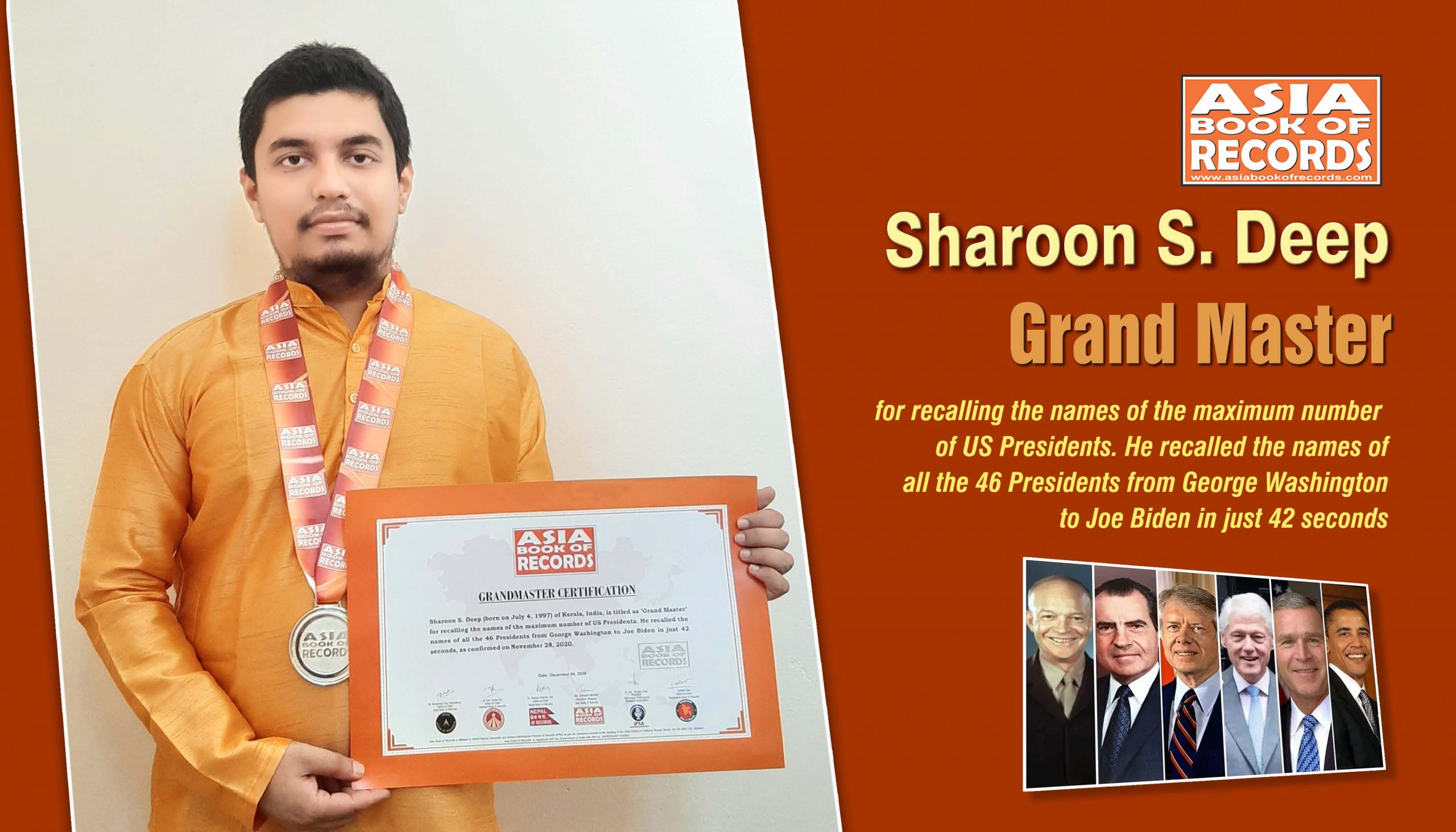 Sharoon S. Deep (born on July 4, 1997) of Kerala, India, is titled as ‘Grand Master’ for recalling the names of the maximum number of US Presidents. He recalled the names of all the 46 Presidents from George Washington to Joe Biden in just 42 seconds, as confirmed on November 28, 2020.