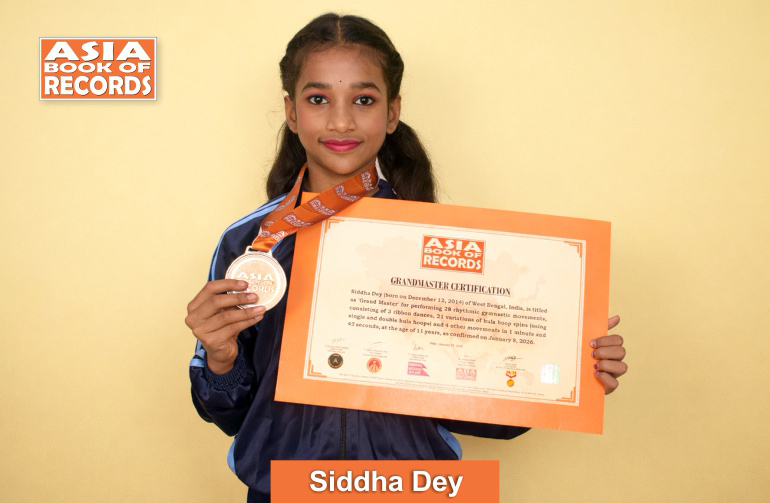 Siddha Dey (born on December 12, 2014) of West Bengal, India, is titled as ‘Grand Master’ for performing 28 rhythmic gymnastic movements, consisting of 3 ribbon dances, 21 variations of hula hoop spins (using single and double hula hoops) and 4 other movements in 1 minute and 42 seconds, at the age of 11 years, as confirmed on January 8, 2026.