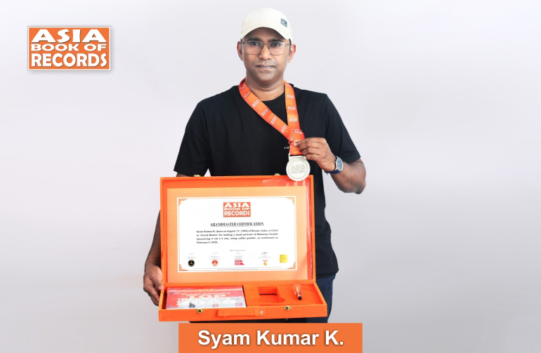 Syam Kumar K. (born on August 17, 1982) of Kerala, India, is titled as ‘Grand Master’ for making a small portrait of Mahatma Gandhi (measuring 5 cm x 4 cm), using coffee powder, as confirmed on February 4, 2026.