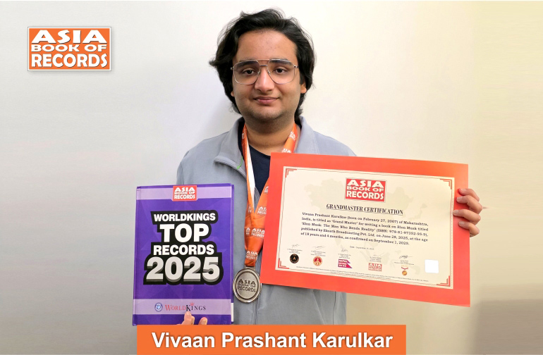 Vivaan Prashant Karulkar (born on February 27, 2007) of Maharashtra, India, is titled as ‘Grand Master’ for writing a book on Elon Musk titled ‘Elon Musk: The Man Who Bends Reality’ (ISBN: 978-81-97352-95-9), published by Eksath Broadcasting Pvt. Ltd. on June 28, 2025, at the age of 18 years and 4 months, as confirmed on September 1, 2025.