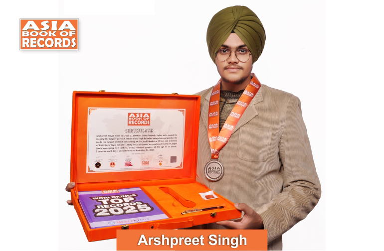 Arshpreet Singh (born on June 2, 2008) of Uttar Pradesh, India, set a record for making the largest portrait of Shri Guru Tegh Bahadur using charcoal powder. He made the largest portrait (measuring 24 feet and 9 inches x 17 feet and 2 inches) of Shri Guru Tegh Bahadur, along with his name, on combined sheets of paper (each measuring 8.3 inches), using charcoal powder, at the age of 17 years, 5 months and 8 days, as confirmed on November 14, 2025.