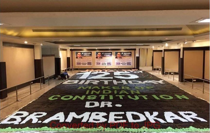 On the occasion of 125th birth anniversary of Dr. B. R. Ambedkar, MSIHMCT Ex. Professor & Ex. Students, Pune , Maharashtra, India, a team comprising of 14 members made largest egg-less truffle cake(65ft x 21ft) weighing 2807kgs, as on April 14, 2016.