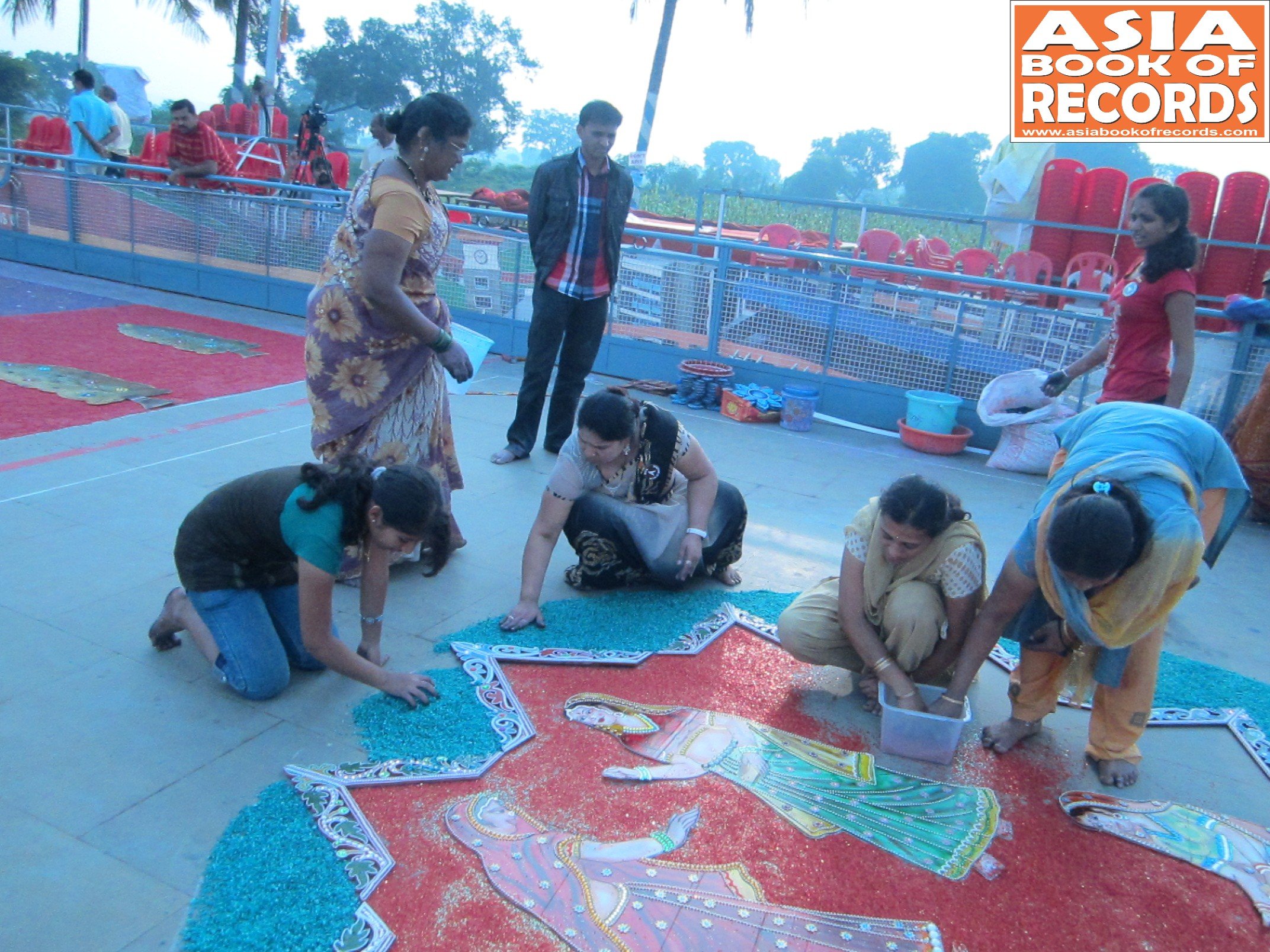 Jyoti R. Chindak and her Group of 12 people (all from India), had created the waste material rangoli measuring over 19,582 sq feet, to mark the celebration of Mother’s Day, on May 13, 2012, at ShivGanga Roller Skating club, Belgaum, Karnataka, India.