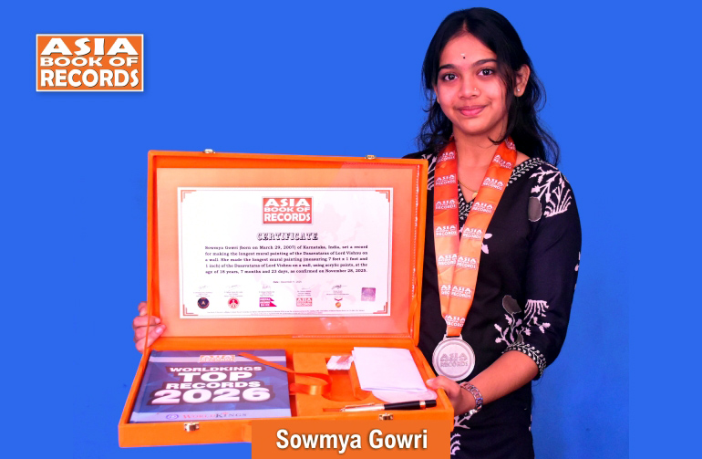 Sowmya Gowri (born on March 29, 2007) of Karnataka, India, set a record for making the longest mural painting of the Dasavataras of Lord Vishnu on a wall. She made the longest mural painting (measuring 7 feet x 1 foot and 1 inch) of the Dasavataras of Lord Vishnu on a wall, using acrylic paints, at the age of 18 years, 7 months and 23 days, as confirmed on November 28, 2025.