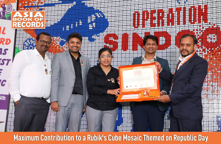 CubeGuru, Karnataka, India, set a record for the maximum contribution to a Rubik’s cube mosaic themed on Republic Day. On the occasion of Republic Day celebration, various participants assembled at Forum Mall, JP Nagar, and created a mosaic art themed on Operation Sindoor, using 4004 Rubik’s Cubes (measuring length 8.23 feet x height 17.01 feet). The mosaic serves as a tribute to our armed forces, symbolizing their courage, sacrifice, and service to the nation, as confirmed on January 25, 2026.