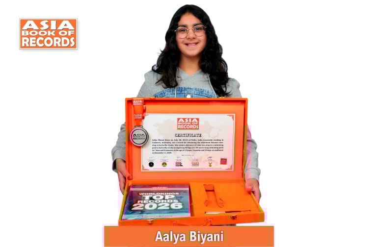 Aalya Biyani (born on July 28, 2013) of Delhi, India (currently residing in Canberra, Australia), set a record for swimming the maximum distance non-stop in butterfly stroke. She swam a distance of 3 km non-stop in a swimming pool in butterfly stroke (comprising 60 laps of a 50-metre-long swimming pool) in 1 hour and 8 minutes, at the age of 12 years, 3 months and 14 days, as confirmed on December 11, 2025.