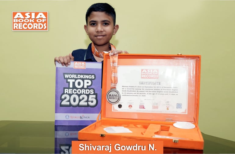 Shivaraj Gowdru N. (born on September 16, 2013) of Karnataka, India, set a record for naming the maximum number of five-letter English words blindfolded. He named 100 five-letter English words blindfolded in 12 minutes and 23 seconds, at the age of 12 years and 11 days, as confirmed on October 10, 2025.