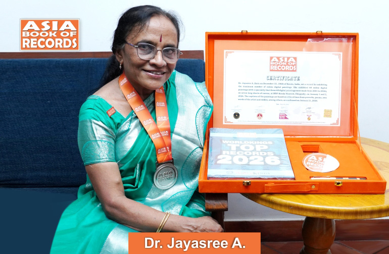 Dr. Jayasree A. (born on December 10, 1960) of Kerala, India, set a record for exhibiting the maximum number of online digital paintings. She exhibited 68 online digital paintings (with a speciality that these 68 digital paintings were made from 2001 to 2026), on seven long sheets of canvas, at MNF Kerala Museum, Edappally, on January 1 and 2, 2026. The captions of the paintings are based on ethical lines from proverbs, poems, own words of the artist and riddles, among others, as confirmed on January 21, 2026.
