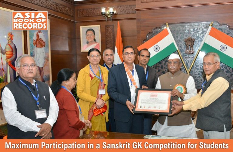 Dr. Krishan Gopal Jangid (Principal, Hamirgarh), Rajasthan, India, set the record for the maximum participation in a Sanskrit General Knowledge competition for students. From the 2010 academic session to the 2025 session, a total of 240,834 students participated—10,530 from classes 1 to 5, 72,825 from classes 6 to 8, 151,256 from classes 9 to 12, and 6,223 at the university level. The Sanskrit General Knowledge Quiz was organized in Bhilwara, Rajasthan. This initiative was launched to promote the study of Sanskrit across multiple levels of education, as confirmed on November 3, 2025.