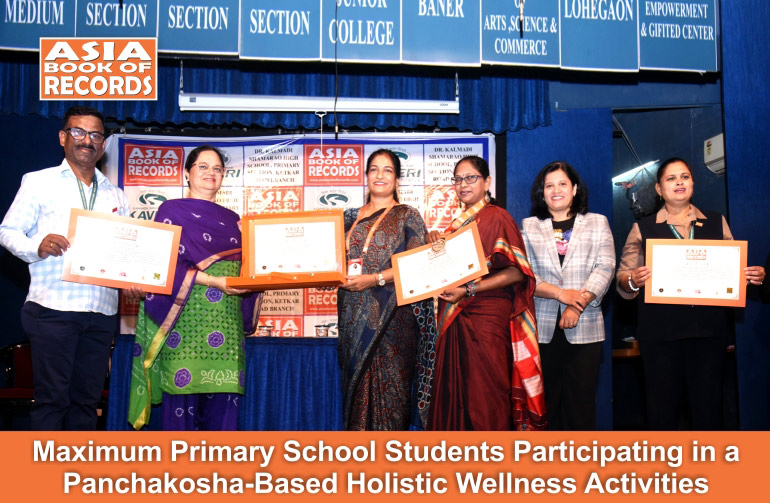 Dr Kalmadi Shamarao High School Primary Section, Pune, Maharashtra, India, set a record for the maximum participation of primary students in Panchkosha-based holistic wellness activities. On February 6, 2026, the school hosted “Catch Me Young” – A Panchakosha Mega Activity, engaging 900 students from Standard I to IV, aged 6 to 10. The programme featured Omkar chanting, Yogasanas, Surya Namaskar, and Shankh Vadan, promoting discipline, unity, and holistic development, as confirmed on February 24, 2026.