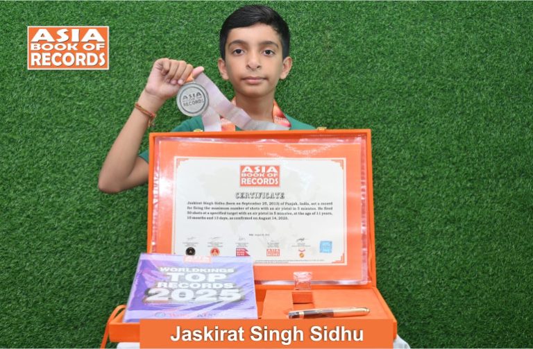 Jaskirat Singh Sidhu (born on September 25, 2013) of Punjab, India, set a record for firing the maximum number of shots with an air pistol in 5 minutes. He fired 50 shots at a specified target with an air pistol in 5 minutes, at the age of 11 years, 10 months and 13 days, as confirmed on August 14, 2025.