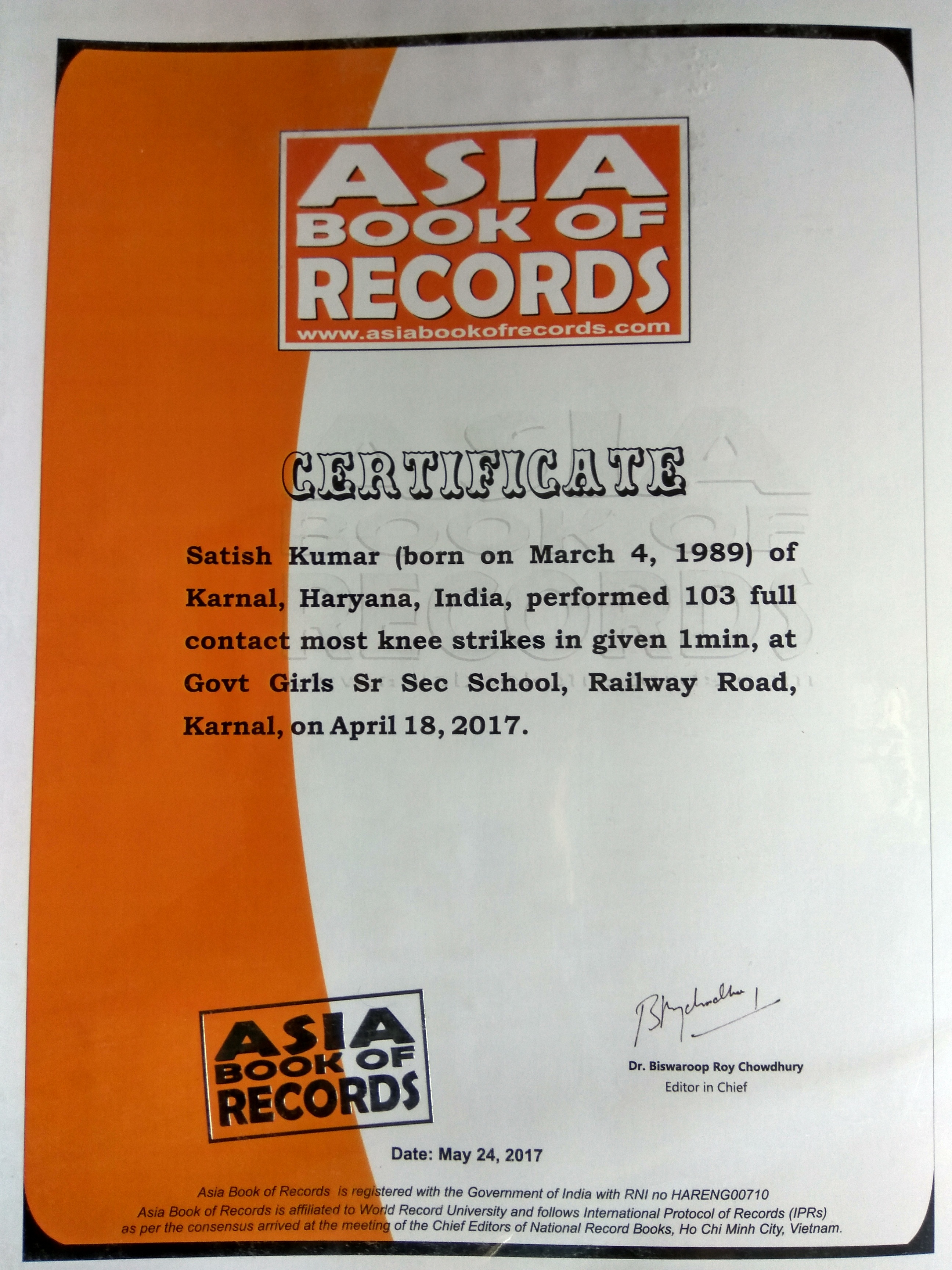 Satish Kumar (born on March 4, 1989) of Karnal, Haryana, India, performed 103 full contact most knee strikes in given 1min, at Govt Girls Sr Sec School, Railway Road, Karnal, on April 18, 2017.