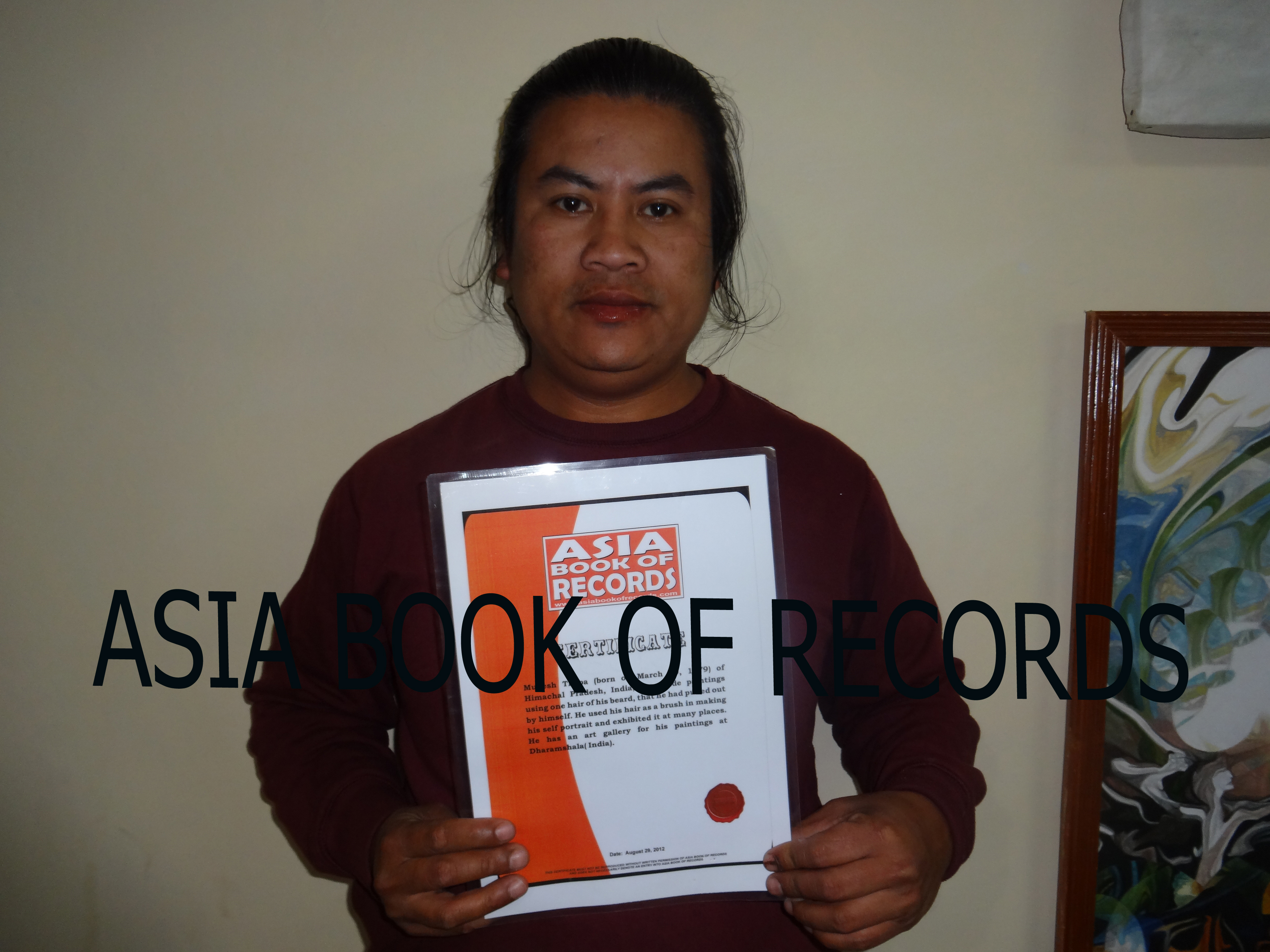 Mukesh Thapa (born on March 29, 1979) of Himachal Pradesh, India, has drawn more than 600 paintings by using one hair of his beard. He used his hair as a brush in creating the paintings and also have exhibited them in many places (all in India).