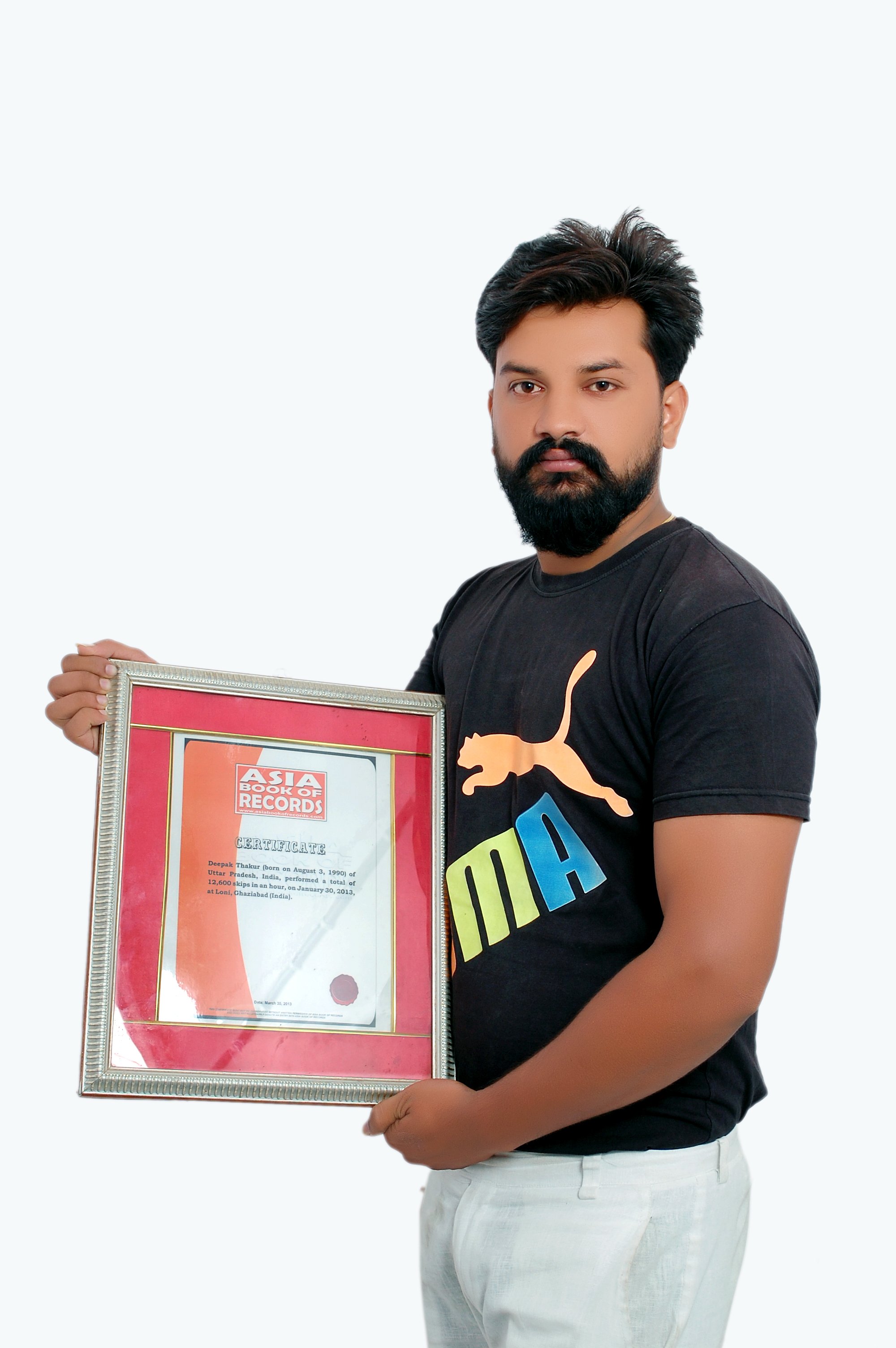 Deepak Thakur (born on August 3, 1990) of Uttar Pradesh, India, performed a total of 12,600 skips in an hour, on January 30, 2013 at Loni, Ghaziabad (India).
