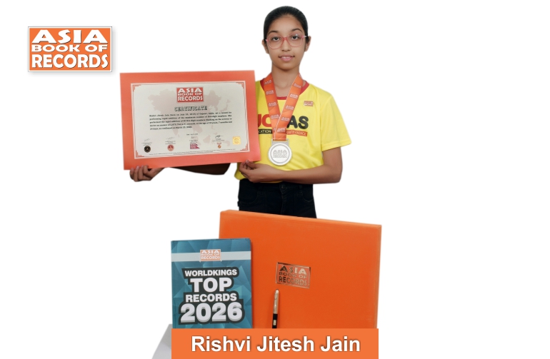 Rishvi Jitesh Jain (born on July 23, 2015) of Gujarat, India, set a record for performing rapid addition of the maximum number of five-digit numbers. She performed the rapid addition of 50 five-digit numbers (flashing on the screen) to derive an answer of 2,875,744 in 41 seconds, at the age of 10 years, 7 months and 24 days, as confirmed on March 25, 2026.