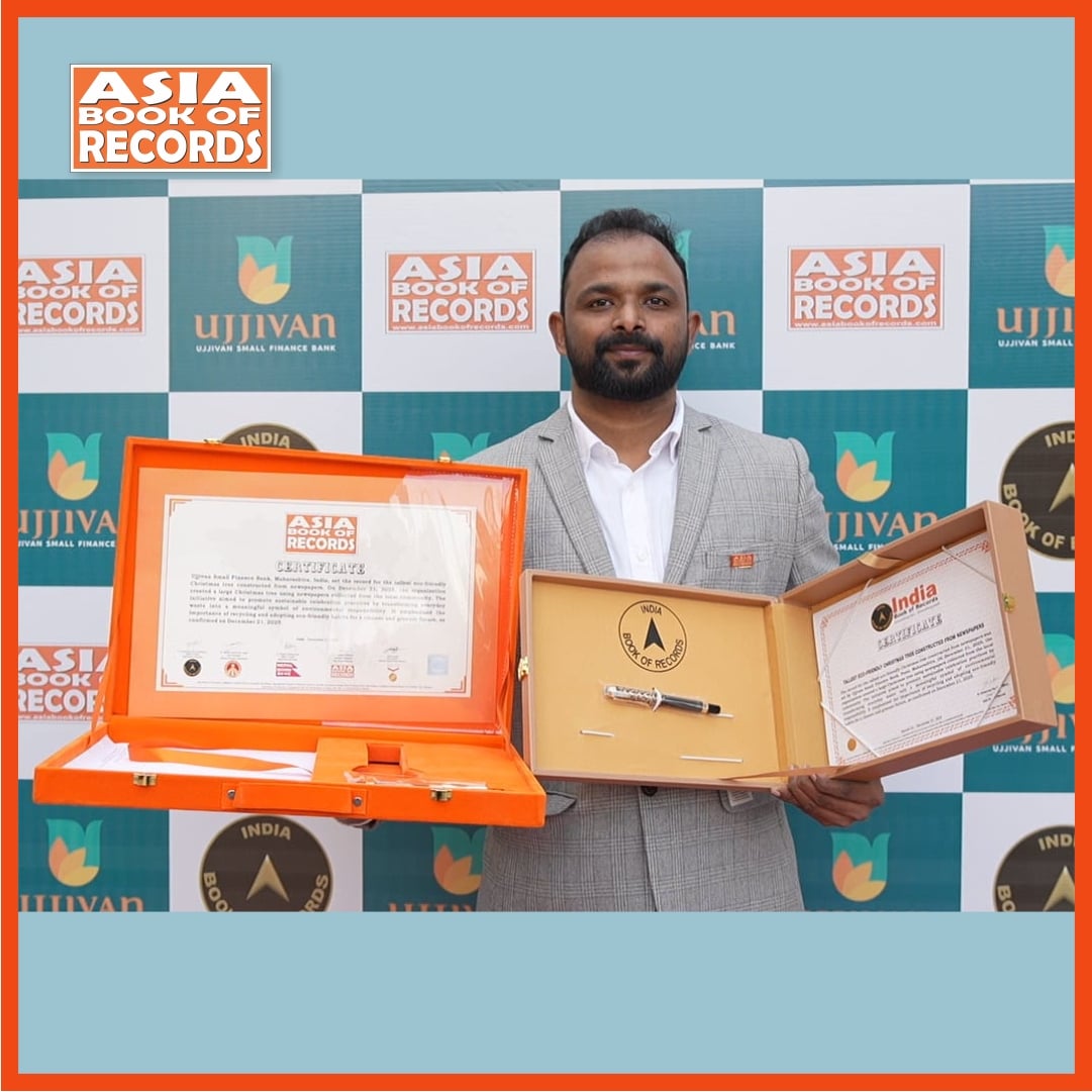 Ujjivan Small Finance Bank, Maharashtra, India, set the record for the tallest eco-friendly Christmas tree constructed from newspapers. On December 21, 2025, the organization created a 21 ft Christmas tree using 52 kg of newspapers collected from the local community. The initiative aimed to promote sustainable celebration practices by transforming everyday waste into a meaningful symbol of environmental responsibility. It emphasized the importance of recycling and adopting eco-friendly habits for a cleaner and greener future, as confirmed on December 21, 2025.