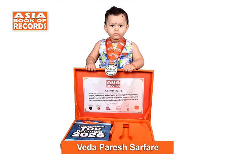 Veda Paresh Sarfare (born on January 22, 2024) of Maharashtra, India, set a record for being the youngest to swim 100 metres. She swam 100 metres (4 laps) across the length of a swimming pool (measuring 25 metres x 22 metres) in 10 minutes and 8 seconds at the Municipal Swimming Pool, Ratnagiri, Maharashtra, at the age of 1 year, 9 months and 10 days, as confirmed on November 29, 2025.